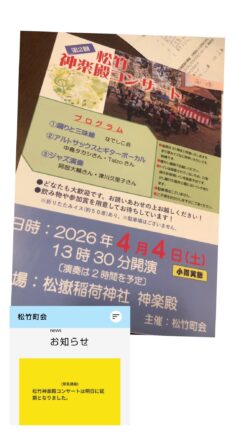 2026年4月5日娘家族の住む八王子市下恩方町の松嶽稲荷神社で松竹町会主催の「第二回 松竹神楽殿コンサート」が、2026年4月5日 日曜日に開催されました。